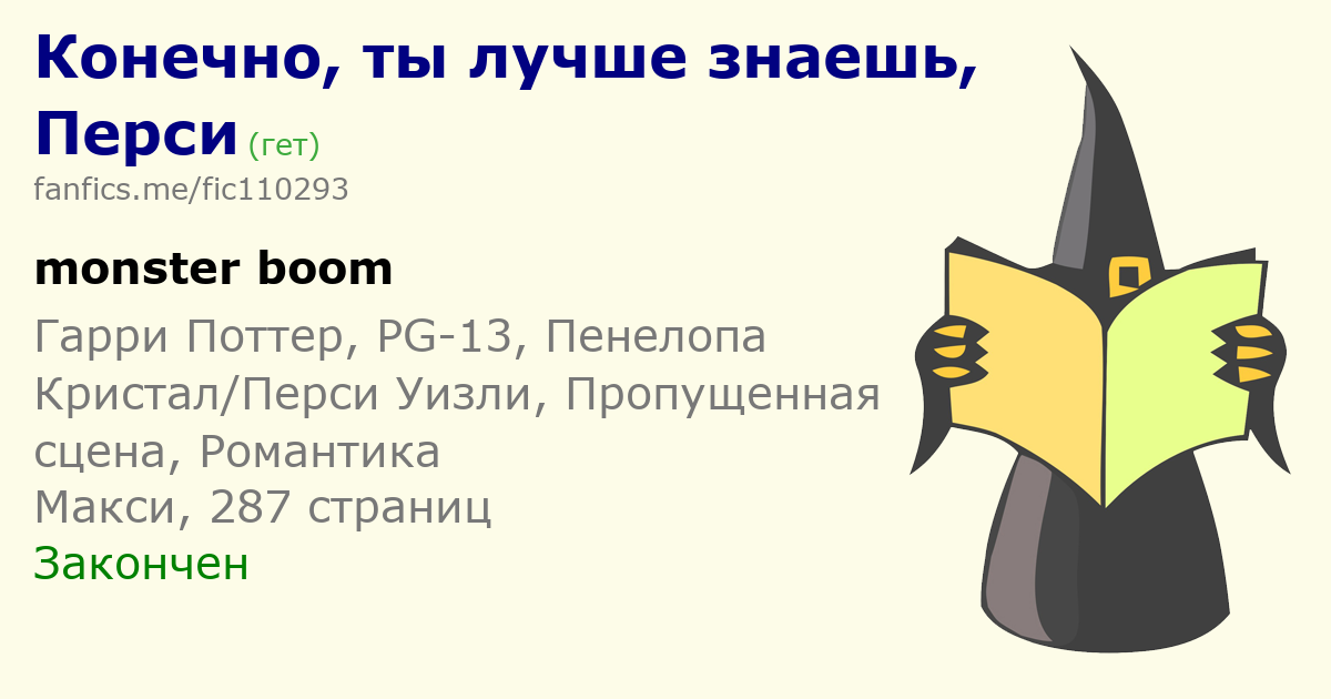 | monster boom Спасибо вам за ответ! Сейчас как раз читаю "Наше фирменное заклинание" - обожаю нестандартный пейринг Тео/Гермиона, сама тоже писала фанфик о них, поэтому интерес особенный;) 1 | |
